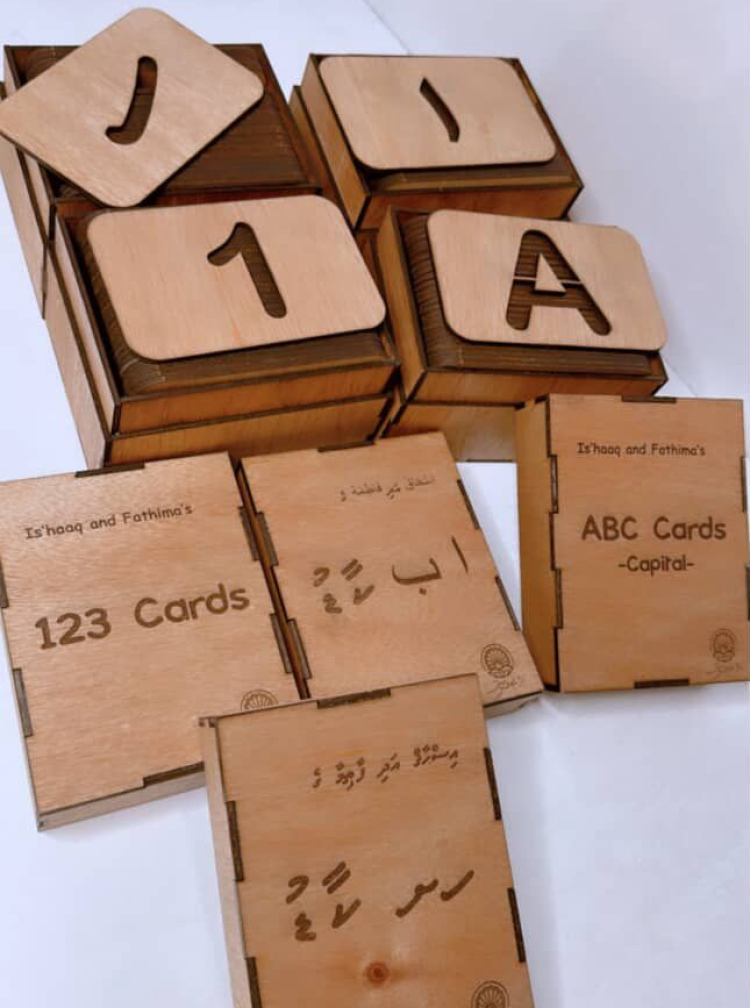 "އަރަބި، އިނގިރޭސި ދިވެހި، ފުރަތަމަ އަކުރު ދަސްކުރަން ކާޑު ހުންނާނެ. މިހާރު ހުންނާނެ ޕަޒްލްސް، ފިލިތަކާ އެކު ދަސްކުރާނެ އެއްޗެހި ވެސް ހުންނާނެ. އެކި ސްޓެޕްސް. އަކުރު ދަސްކޮށްފައި ދެން އިންނާނީ އެއާ ގުޅޭ އެއްޗެއް ހަދަން،" ފިރިމީހާގެ އެހީތެރިކަމާ އެކު ވިޔަފާރި ހިނގަމުންދާ ގޮތް ލީނާ ކިޔައިދިނެވެ.